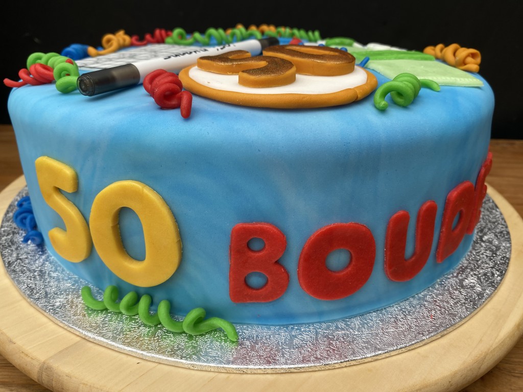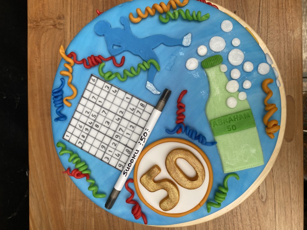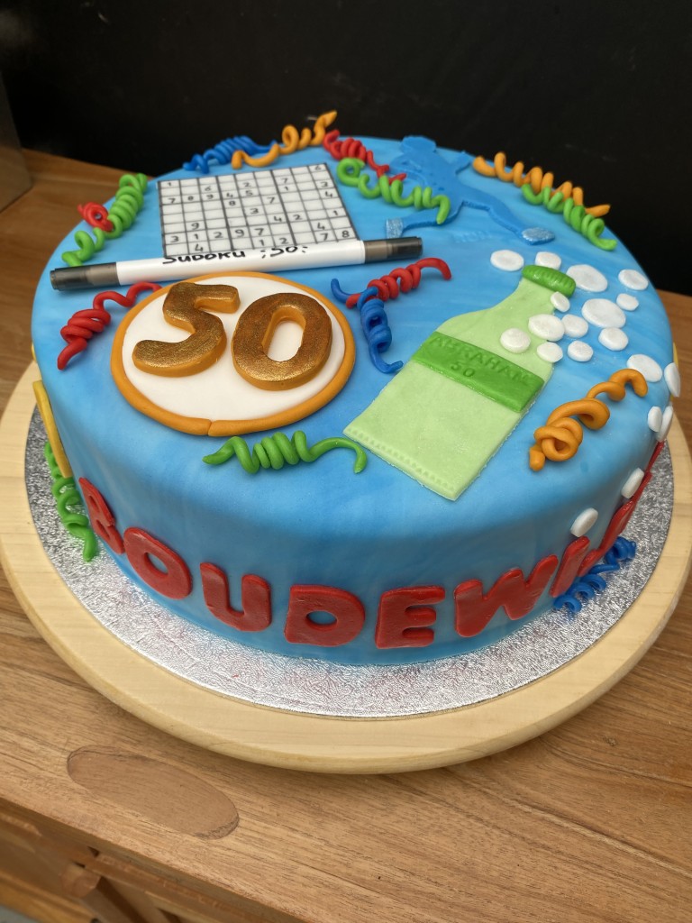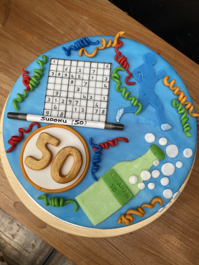 Heerlijke taart met zelf getekende sudoku op de bovenkant en daarbij een stift met eetbare inkt, zodat de jarige de sudoku echt kan maken en daarna opeten. Gevuld met aardbeien, Chantilly en aardbeienjam.