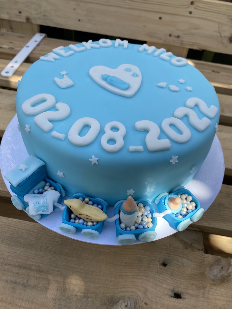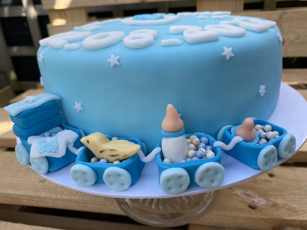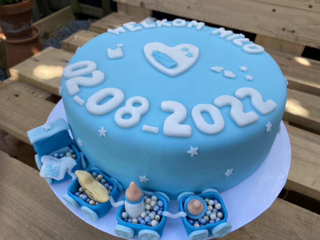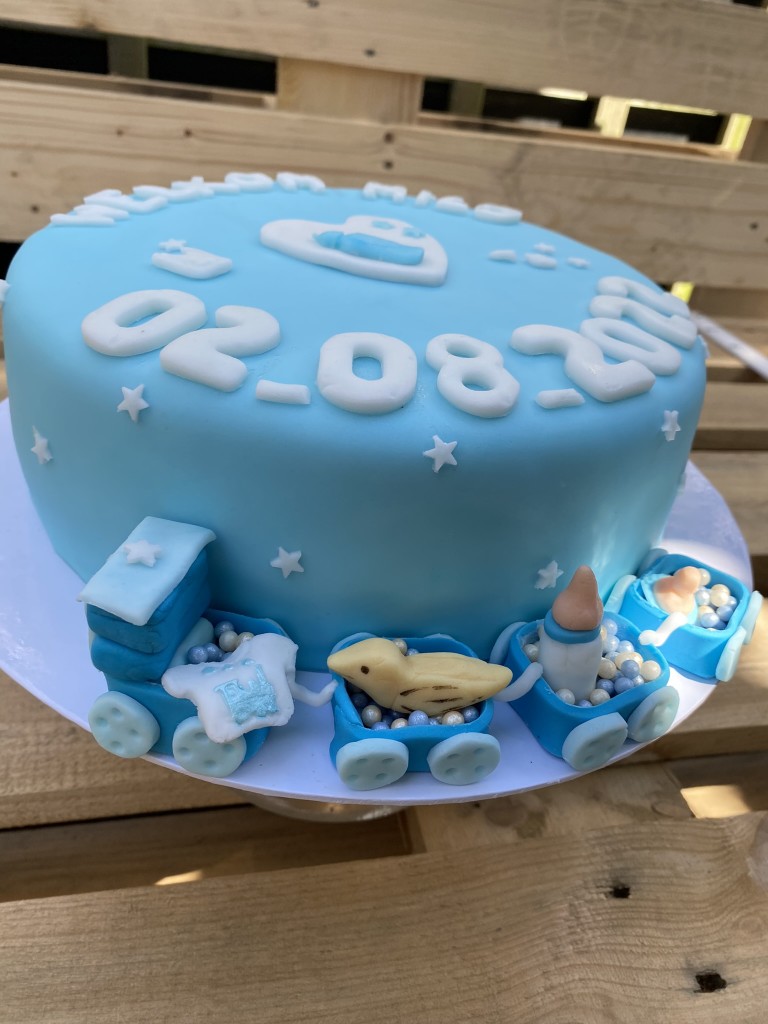 Een glutenvrije baby geboorte taart die gevuld is met slagroom en verse aardbeien.
