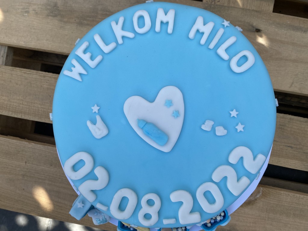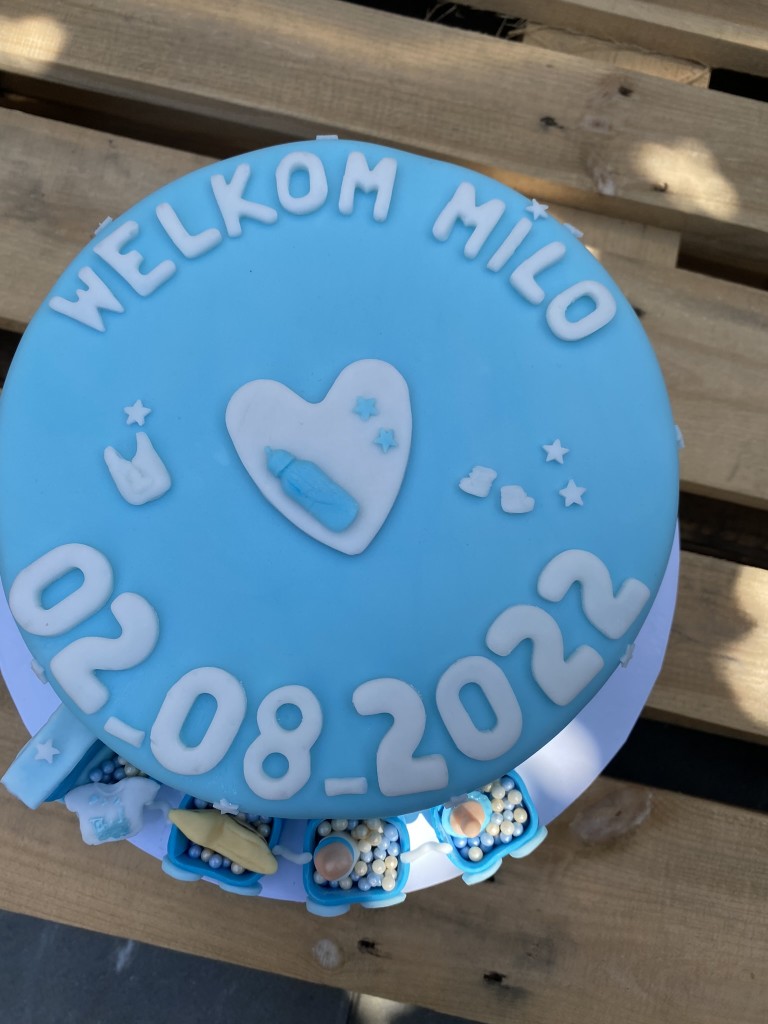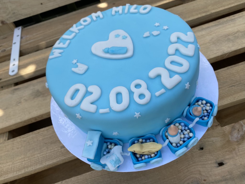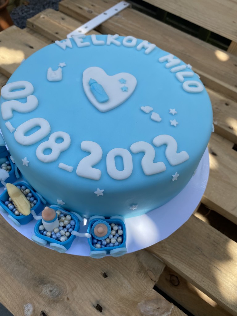 Een glutenvrije baby geboorte taart die gevuld is met slagroom en verse aardbeien.