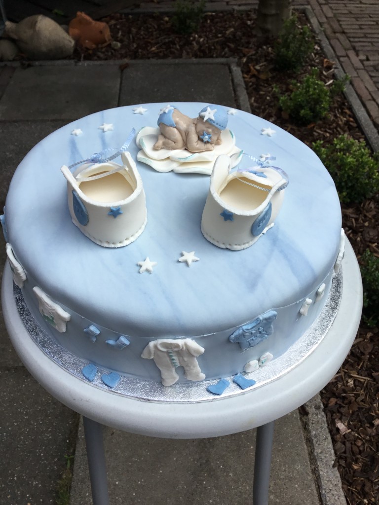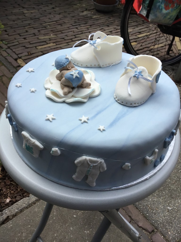 Deze glutenvrije babyshower cake is voor ouders waarvoor het geslacht van hun kindje geen verrassing meer is. Hun zoontje zal vast een prachtige huidskleur hebben want de vader is half Cubaans. Vandaar ook de vraag of ik de baby op de taart in een licht tintje kon maken. De taart is gevuld met verse aardbeien en slagroom, altijd een favoriete vulling in de zomer.