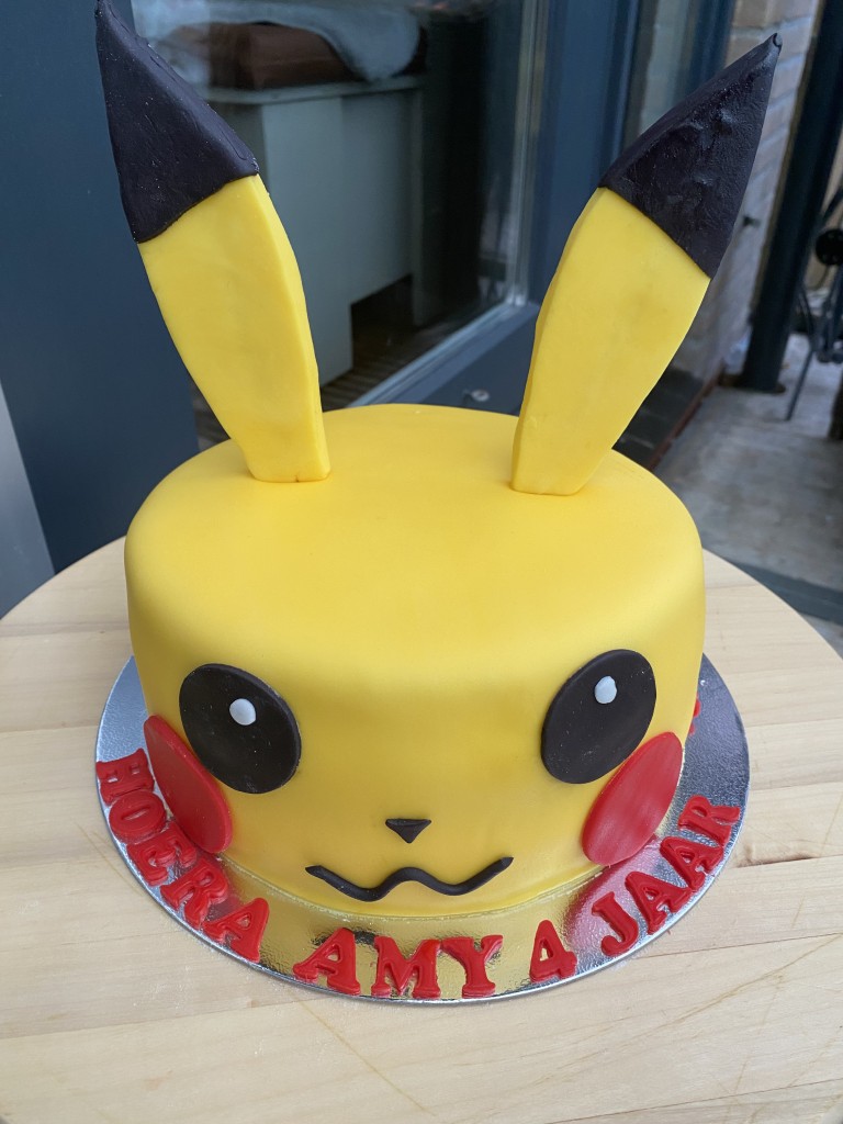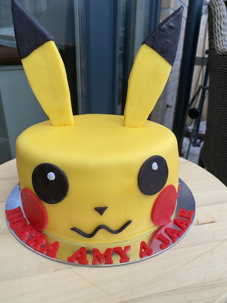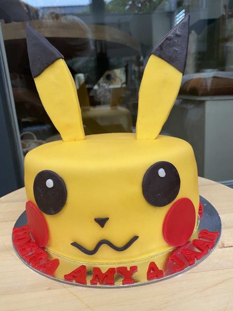 De Pikachu taart is gevuld met banketbakkersroom, verse aardbeien en aardbeienjam.
