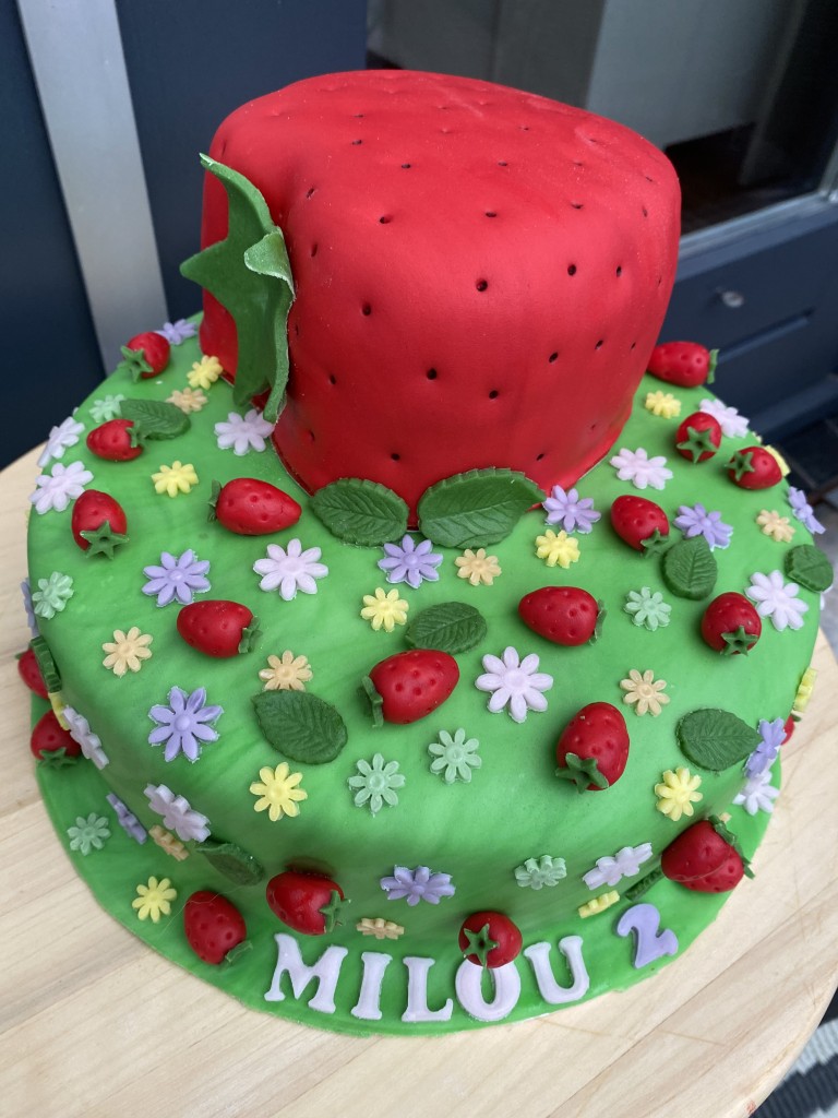 Super vrolijke en heerlijke taart waarvan het bovenste deel uiteraard gevuld is met verse aardbeien, Chantilly en aardbeienjam. De onderste laag is gevuld met choco Chantilly, stukjes chocolade en een laagje Nutella.