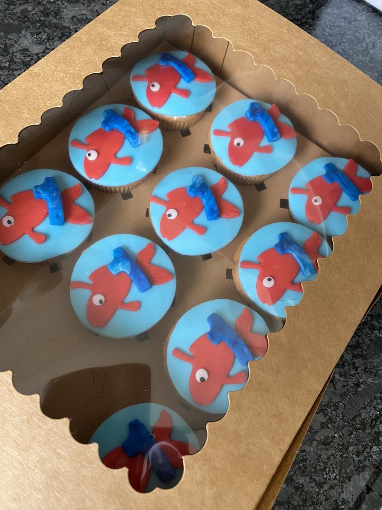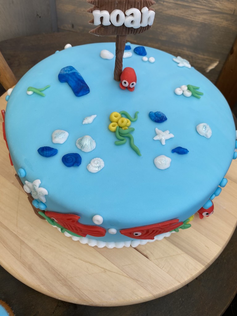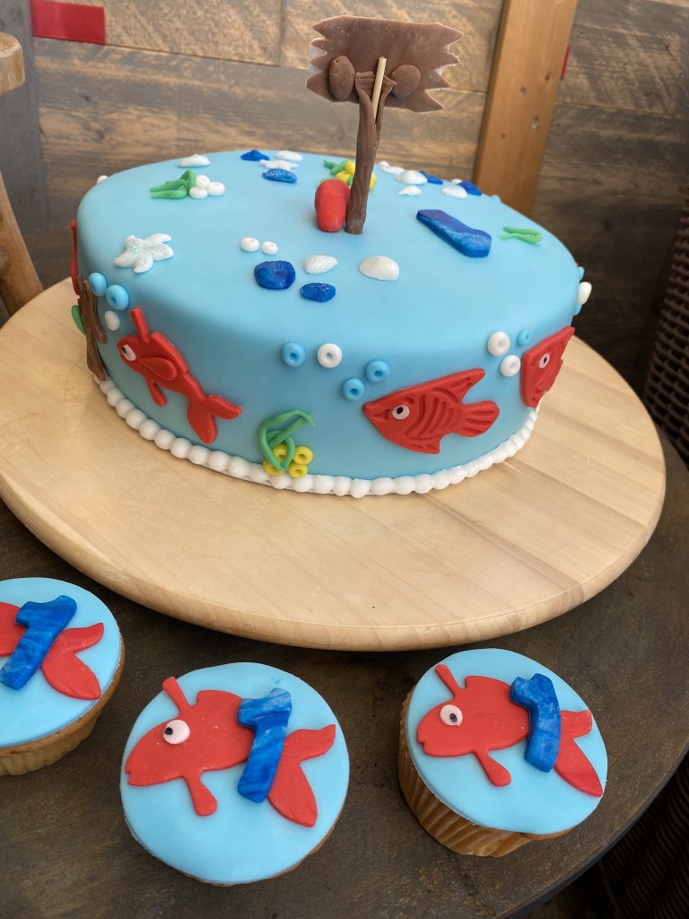 Deze leuke vissen taart is voor de helft gevuld met Chantilly Cream en verkruimelde oreokoekjes en de andere helft met Chantilly Cream en aardbeien. De Smashcake is ook opgespoten met Chantilly Cream.