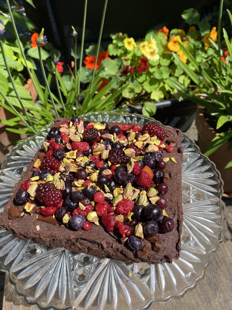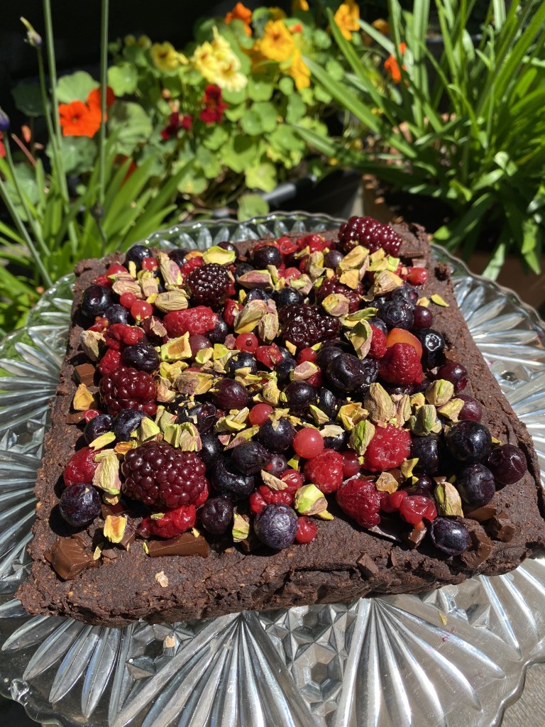 Zomerse zoete aardappel brownie met zomer fruit en pistachenoten